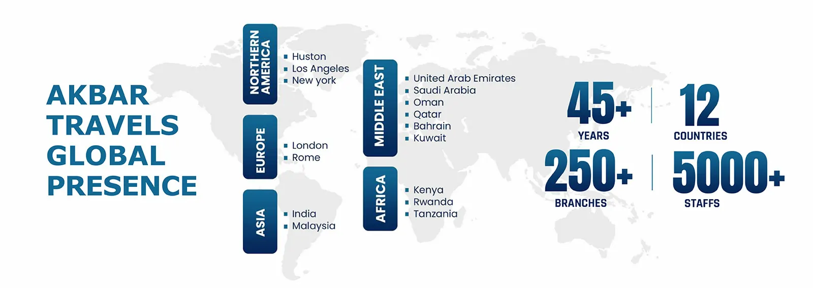 Our Global PresenceWith over 300+ Akbar Travels offices worldwide and a powerful online portal, Akbar BizVoy is uniquely positioned to deliver consistent, high-quality service - whether your employees are flying from Dubai to New York or attending a conference in Singapore.